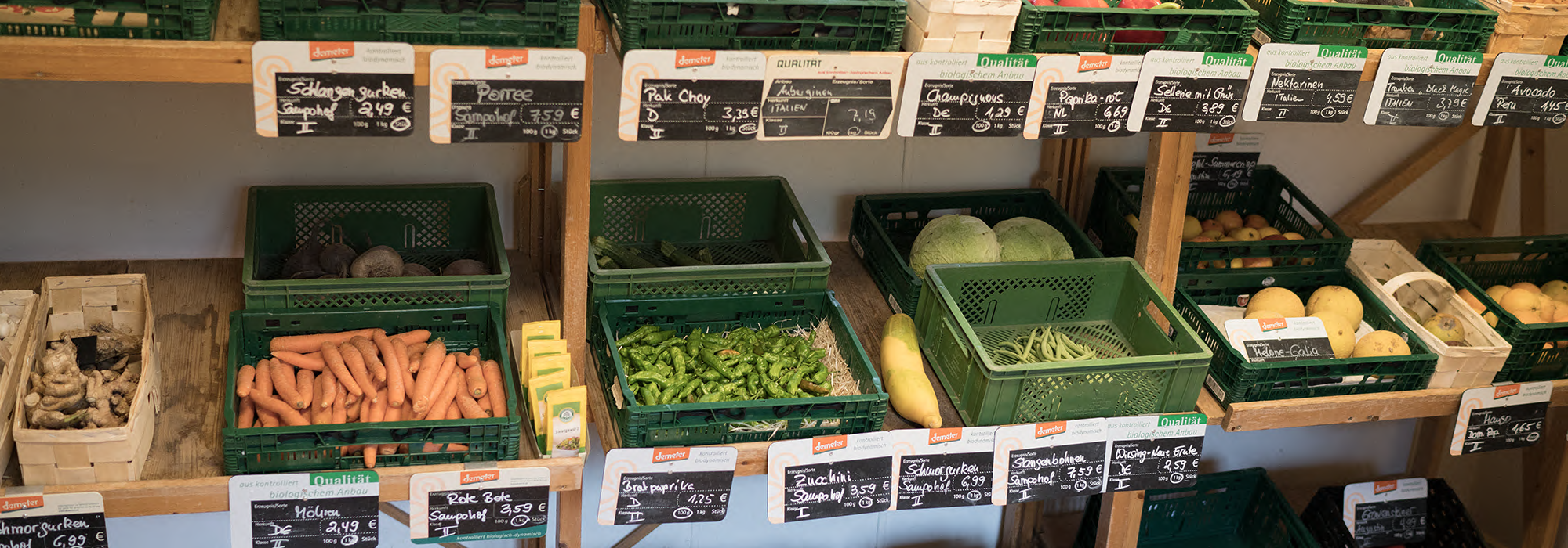 Direkt neben unserem Haupthaus führen wir im Haus „Tarskavaig“ einen eigenen Dorfladen mit einem umfangreichen Angebot an Produkten in Bio-Qualität. Wo immer es möglich ist, achten wir nicht nur auf regionale Herkunft, sondern bevorzugen auch die biologisch-dynamische Anbauweise mit dem besonders strengen Demeter-Label.